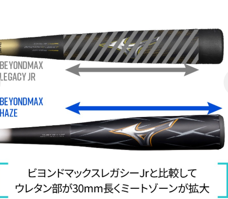 ・一般軟式用ビヨンドマックスレガシーと同じ先端キャップ式により、ウレタン部がより広くなり、ビヨンドマックスレガシーJrと比較してミートゾーンも拡大。